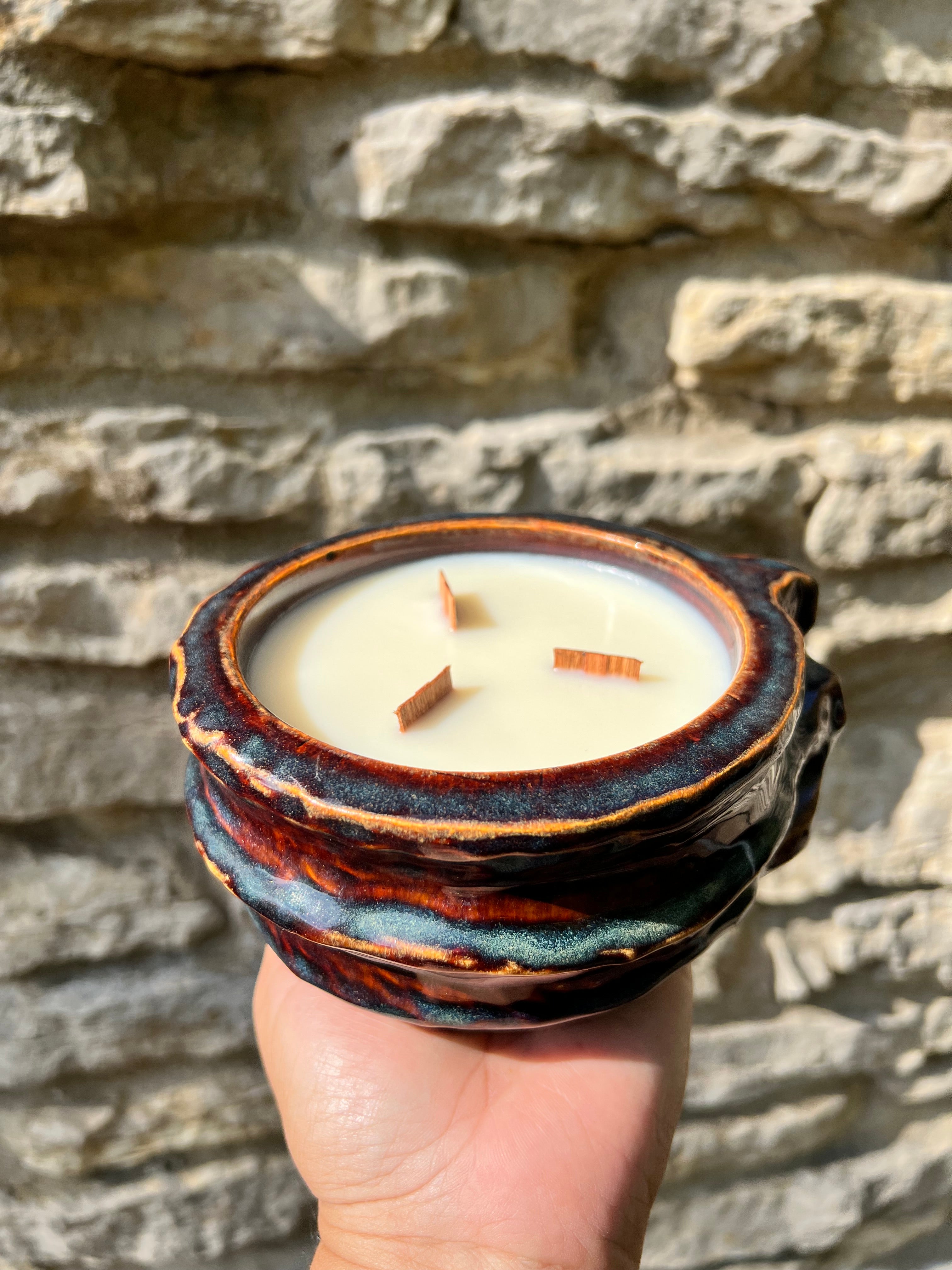 His pieces blend both functional and decorative sensibilities: hand-formed vessels, sculptural objects, tactile surfaces, organic silhouettes, earthy, nature-inspired textures. Every piece invites the viewer — and the user — into a moment of stillness. These vessels are not just candle containers they’re keepsakes, artworks, and part of the story our studio tells.