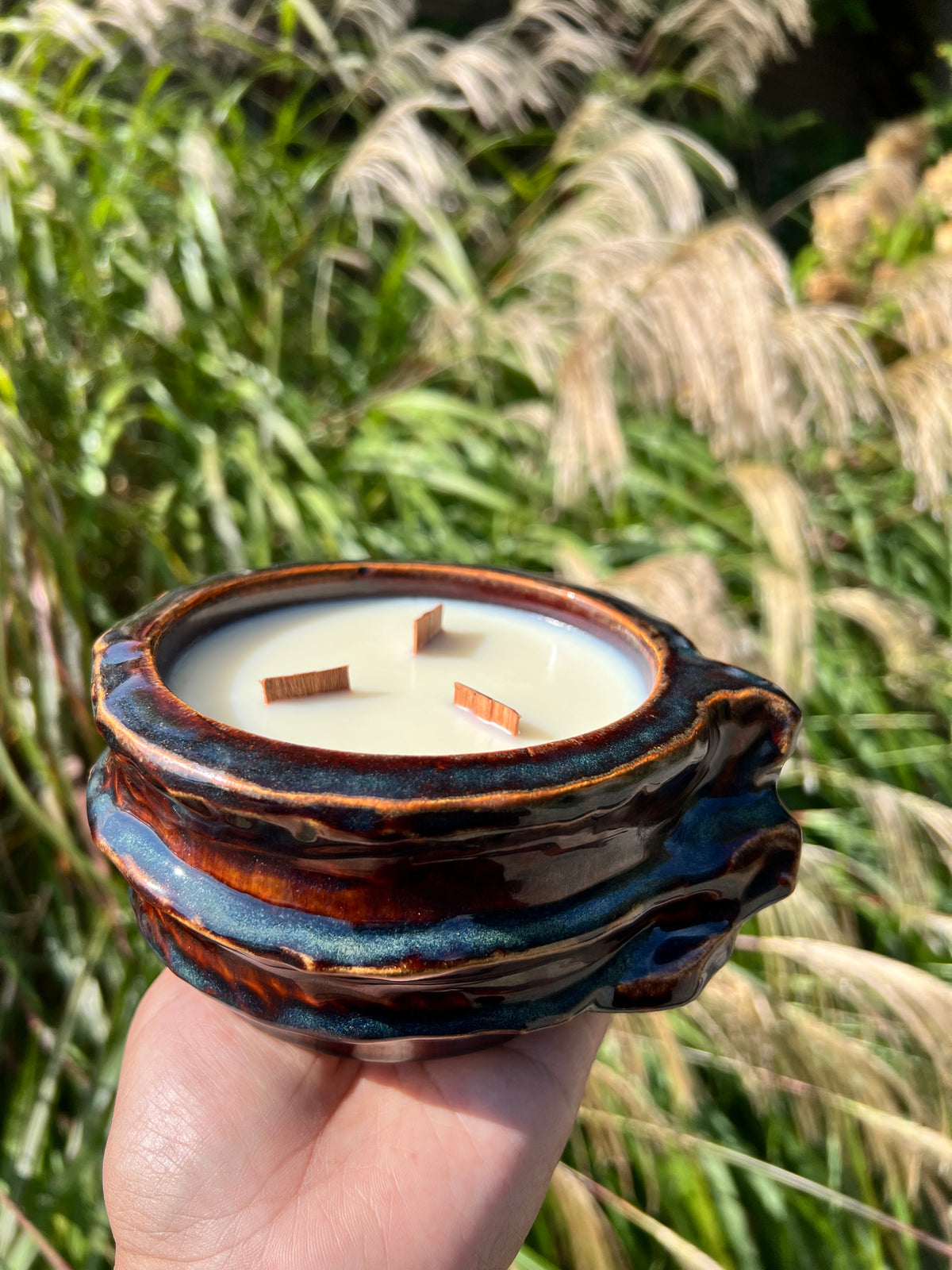 Our Signature Ceramic Candle is created exclusively for Lumen Creek Studios by Richard Mulligan of Nuna Ceramics. Each vessel is hand-formed, shaped with minimal tools, and crafted to preserve the natural grooves, textures, and subtle imperfections of the human hand.